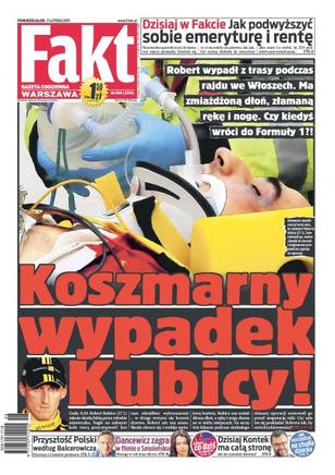 Robert Kubica wypadł z trasy podczas rajdu we Włoszech - ma zmiażdżoną dłoń, złamaną rękę i nogę; Leszek Balcerowicz przedstawia swoją wizję reform; jak dostać wyższe dodatki do emerytur; Renata Dancewicz zagra w filmie o katastrofie smoleńskiej; Justyny Kowalczyk już nikt nie da rady dogonić; Adam Małysz w Oberstdorfie musiał zmagać się z niedyspozycją żołądkową.