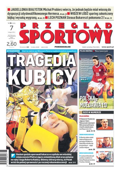 Siedem godzin operowali lekarze w szpitalu we włoskiej miejscowości Pietra Ligure zmiażdżoną dłoń oraz połamane rękę i nogę Roberta Kubicy; Justyna Kowalczyk ucieka rywalkom w klasyfikacji generalnej Pucharu Świata; bardzo dobre skoki Adama Małysza nie pomogły Polakom w niedzielę w konkursie drużynowym; Sławomir Peszko i Adam Matuszczyk w barwach Köln przyczynili się do triumfu swej drużyny nad Bayernem 3:2; Leo Messi strzelił trzy gole Atletico Madryt i jego drużyna pobiła kolejny rekord, tym razem legendarnego Realu Madryt.