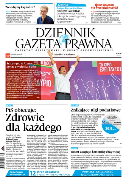 Pracujesz czy nie, musisz mieć prawo do bezpłatnego leczenia – taki jest plan PiS na reformę systemu zdrowia, partia proponuje likwidację składki i dostęp do leczenia dla wszystkich; gdyby proponowany przez PO nowy jednolity podatek wszedł w życie, dla objętych nim podatników zniknąłby cały wachlarz istniejących dziś ulg, m.in. na dzieci czy wspólne rozliczenie małżonków, autorzy pomysłu zapewniają jednak, że korzyści z ulg i odliczeń dla podatników przetrwają w innej formie we wzorze na wyliczanie podatku; jak wynika z sondaży, lewicowa Syriza wygrała wczorajsze przedterminowe wybory w Grecji i ma średnio o dwa punkty proc. więcej niż konserwatywna Nowa Demokracja, taki wynik nie wystarczy jednak, by Syriza mogła samodzielnie rządzić; komornicy nie będą płacić VAT od wydatków, które ponoszą w toku egzekucji i na które pobierają zaliczki od wierzycieli; wszystkie próby wprowadzania powszechnej równości w sprawach majątkowych okazały się utopiami, ale kapitalizm musi się zmienić – ocenia Henryka Bochniarz, prezydent Konfederacji Lewiatan; Grażyna Piotrowska-Oliwa: ostatnie nominacje w spółce Europol Gaz pokazują, że tematykę gazową traktujemy inaczej, niż powinniśmy.
