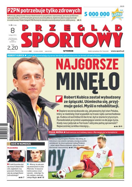 Robert Kubica został wybudzony ze śpiączki, uśmiecha się, przyjmuje gości i myśli o rehabilitacji; piłkarze powołani na mecz z Norwegią dotarli do Portugalii w komplecie; Franck Essomba jest jednym z kandydatów do zastąpienia w drużynie lidera ekstraklasy Kamila Grosickiego; The Reds wygrali cztery ostatnie mecze, w żadnym z nich nie tracąc bramki; była liderka rankingu WTA od tygodni przyjmuje antybiotyki i chodzi o kulach - nie wiadomo, czy jeszcze zdoła wrócić na kort.