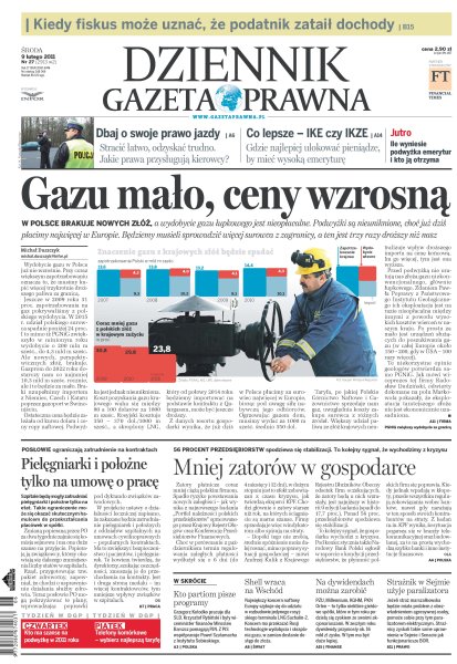 Kiedy fiskus może uznać, że podatnik zataił dochody; gdzie najlepiej ulokować pieniądze, by mieć wysoką emeryturę; w Polsce brakuje nowych złóż, a wydobycie gazu łupkowego jest nieopłacalne - podwyżki są nieuniknione, choć już dziś płacimy najwięcej w Europie; szpitale będą mogły zatrudniać pielęgniarki i położne tylko na etat; największy koncern naftowy Europy szykuje się do udziału w rozbudowie jedynego rosyjskiego terminalu LNG Sachalin-2; jeżeli straż marszałkowska będzie miała problem z obezwładnieniem agresywnej osoby, pomoże sobie przy tym paralizatorem elektrycznym.