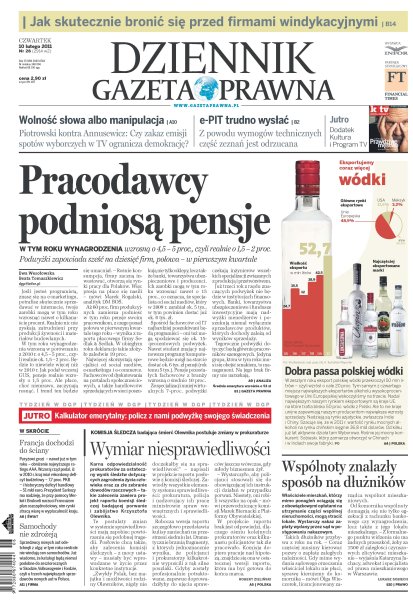 Jak skutecznie bronić się przed firmami windykacyjnymi; czy zakaz emisji spotów wyborczych w TV ogranicza demokrację; w tym roku wynagrodzenia wzrosną o 4,5–5 proc., czyli realnie o 1,5–2 proc. - podwyżki zapowiada sześć na dziesięć firm, połowa – w pierwszym kwartale; w zeszłym roku eksport polskiej wódki przekroczył 50 mln litrów, czyli wzrósł o całe 20 proc.; komisja śledcza badająca śmierć Olewnika postuluje zmiany w prokuraturze; wspólnoty mieszkaniowe znalazły sposób na dłużników; Paryżowi grozi – nawet już w tym roku – obniżenie najwyższego ratingu AAA.