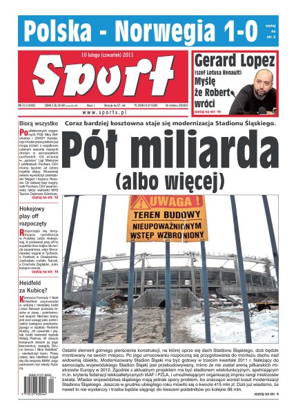 Coraz bardziej kosztowna staje się modernizacja Stadionu Śląskiego; Ashley Young, wprowadzony na boisko w miejsce bezbarwnie grającego Wayne’a Rooneya, przesądził o wygranej Anglików nad Duńczykami; wczoraj w Vikersund, na zachód od Oslo, oficjalnie otwarto największą na świecie skocznię narciarską; Skra Bełchatów w kapitalnym stylu wywalczyła sobie przepustkę do grona sześciu najlepszych zespołów w Europie; Robert Kubica zostanie dzisiaj przeniesiony z oddziału intensywnej terapii do normalnej sali w szpitalu Santa Corona.