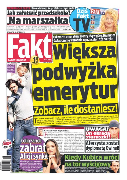 Prezydencki minister Sławomir Nowak skarży się, że media polują na wpadki prezydenta; marcowa waloryzacja świadczeń będzie wyższa, niż przewidywał rząd; irlandzki gwiazdor znalazł czas na to, by w końcu pobawić się ze swoim synkiem - Alicji Bachledy-Curuś z nimi nie było; w zespole Lotus Renault wszyscy żyją nadzieją na powrót Roberta Kubicy na tor jeszcze w tym sezonie Formuły 1; trener Robert Maaskant po wizycie na zgrupowaniu właściciela klubu wziął zawodników do galopu.