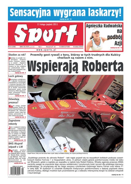 Przemiły gest rywali z toru, którzy w tych trudnych dla Kubicy chwilach są razem z nim; dlaczego przetarg na projekt modernizacji stadionu przy Cichej odłożony w czasie; możliwe, że 16 lutego Dariusz Kozielski przestanie być prezesem pierwszoligowca z Bogumińskiej; Lionel Messi znów okazał się lepszy od Cristiana Ronaldo; już w weekend możemy poznać najlepszego skoczka sezonu oraz nowego rekordzistę w długości lotu na nartach.