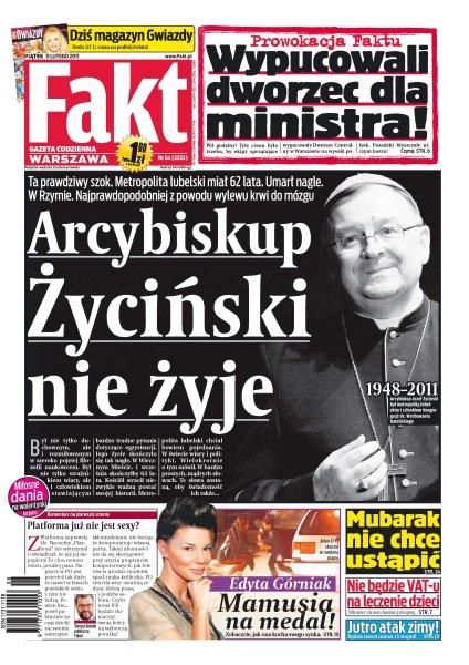 Wiadomość o śmierci metropolity lubelskiego wstrząsnęła całą Polską; minister zniesie VAT na leczenie dzieci; pieniądze ze sprzedaży pamiątek od znamienitych osobistości pomogą Fundacji Faktu w walce o zdrowie dzieci; Ania Mucha pokazuje pazurki na planie serialu „Prosto w serce”; Edyta Górniak ma już nową menedżerkę; gdyby Robert Kubica wpadł na barierę drogową w bolidzie Formuły 1, nie miałby nawet zadrapań.
