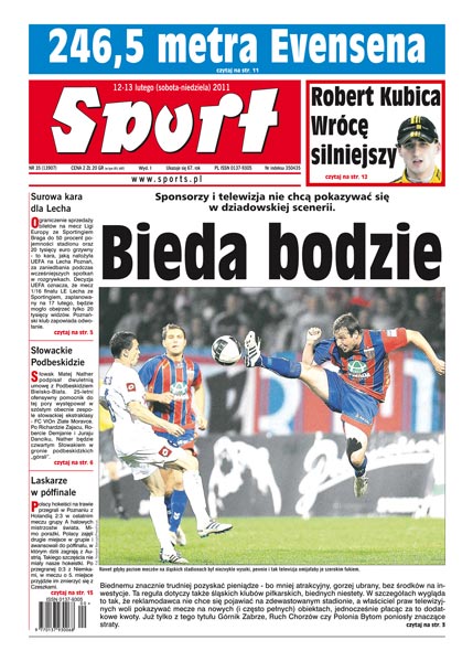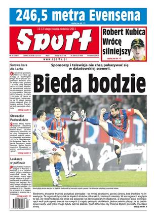 Nieoficjalny rekord świata w skokach narciarskich wynosi od wczoraj 246,5 m; sponsorzy i telewizja nie chcą się pokazywać w dziadowskiej scenerii, co skutkuje stratami śląskich klubów; EUFA wymierzyła Lechowi surową karę: na mecz ze Stortingiem Braga będzie mogło wejść tylko 20 tys. kibiców; wprawdzie polscy hokeiści na trawie przegrali w ostatnim meczu grupowym, ale awansowali do półfinału halowego turnieju rozgrywanego w Poznaniu; Robert Kubica twierdzi, że po wypadku wróci na tor silniejszy; w Anglii derby Manchesteru prawdopodobnie rozstrzygną o losach tytułu mistrzowskiego.