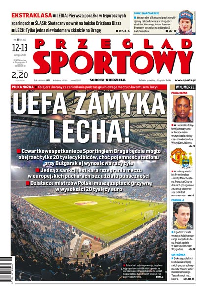 Za zaniedbania podczas grudniowego meczu z Juventusem Turyn UEFA ukarała Lecha ograniczeniem liczby widzów spotkania ze Sportingiem Braga do 20 tys.; padł nieoficjalny rekord świata w długości skoków narciarskich – Norweg Johan Remen Evensen poleciał na odległość 246,5 metra; Legia poniosła pierwszą porażkę w tegorocznych sparingach; w Śląsku skutecznym powrotem na boisko popisał się Cristian Diaz; dziś derby Manchesteru – jeśli City polegnie, to straci szansę na mistrzostwo; dziewięć godzin trwała kolejna operacja Roberta Kubicy; sukcesy polskich klubów siatkarskich w europejskich rozgrywkach wymusiły zmiany w terminarzu PlusLigi.