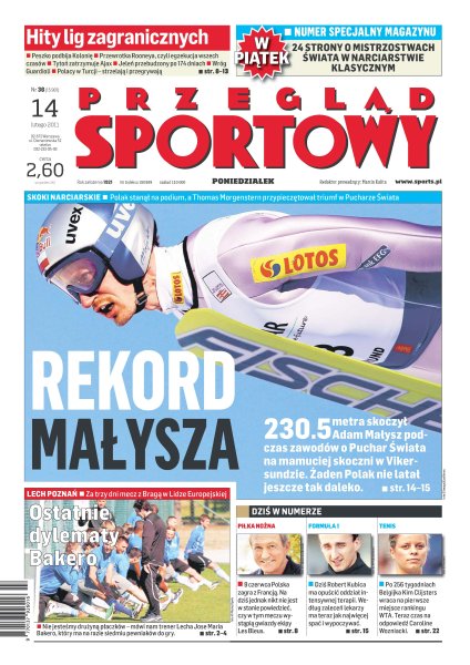 230,5 metra skoczył Adam Małysz podczas zawodów o Puchar Świata na mamuciej skoczni w Vikersundzie - żaden Polak nie latał jeszcze tak daleko; największą gwiazdą meczu Czarnych Koszul z Lokomotiwem Płowdiw był arbiter; po niesamowitym strzale nożycami Rooneya Manchester United wygrał 2:1 derby miasta; Kędzierzynianie przegrali w tym sezonie ligowym już trzeci mecz ze Skrą, lecz po raz pierwszy nie zdobyli punktu.