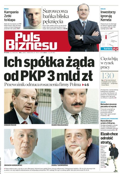 Radio Zet traci dystans do RMF - Robert Kozyra, były szef stacji, uważa, że nowa strategia jest prezentem dla rywala; ilu bezrobotnych przybędzie przez rządowe oszczędności; prokurator przychylił się do wniosku o upadłość producenta alkoholi Belvedere; Krzysztof Urbanowicz, prezes potentata na rynku urządzeń fiskalnych, zapowiada, że spółka będzie szukała nowych nisz; nowa odsłona sporu o grunty w sercu Warszawy: akcjonariusze upadłej Polmy chcą ją reaktywować.