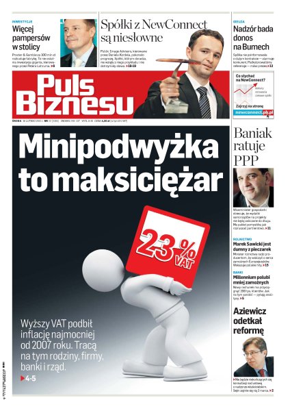 Procter & Gamble za 100 mln zł rozbuduje fabrykę, a to nie ostatnia inwestycja giganta kierowanego przez Petera Lohruma; wiceminister gospodarki obiecuje, że wydatki samorządów na projekty nie będą zaliczane do długu; minister rolnictwa radzi producentom, by walczyli o serca zamożnych Europejczyków; nie będzie niekończących się konsultacji nad ustawą o nadzorze właścicielskim – Sejm zajmie się nią 2 marca; wyższy VAT podbił inflację najmocniej od 2007 roku – tracą na tym rodziny, firmy, banki i rząd.