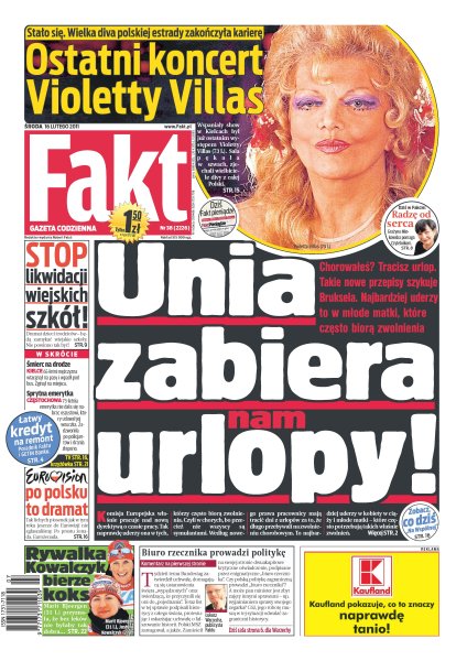 Czy urzędnicy z Unii Europejskiej zabiorą matkom urlopy; aż siedmiu urzędników, z ministrem na czele, przecięło wstęgę na otwarciu obwodnicy; PKP znów likwiduje nam pociągi; kto chce zniszczyć miłość Nergala i Dody; wspaniały show w Kielcach podsumował 50-letnią karierę Violetty Villas; Wojciech Szczęsny, bramkarz Kanonierów, musi powstrzymać najlepsze trio napastników świata; niecodzienny konkurs na Wielkiej Krokwi w Zakopanem już w marcu; rywalka Justyny Kowalczyk otwarcie przyznaje, że bez leków nie miałaby szans na sukcesy.