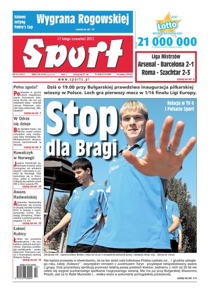 Dziś o 19.00 przy Bułgarskiej prawdziwa inauguracja piłkarskiej wiosny w Polsce - Lech gra pierwszy mecz w 1/16 finału Ligi Europy; Domingos Paciencia, trener Bragi, sięgnął po sześciu piłkarzy z satelickiej Vizeli, żeby skompletować kadrę na Lecha; Wojciech Szczęsny swój debiut w Lidze Mistrzów zapamięta na długo - po fantastycznym finiszu „Kanonierów” Hiszpanie opuszczali plac gry na tarczy; Justyna Kowalczyk dziś zamelduje się w Norwegii, gdzie za tydzień walczyć będzie o medale mistrzostw świata.