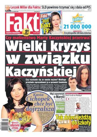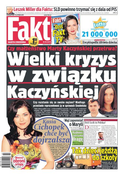 Czy małżeństwo Marty Kaczyńskiej przechodzi wielki kryzys; minister Jolanta Fedak obiecuje Polakom, że będzie bronić ich wolnych dni; drugi Tu-154 pół roku temu wrócił z remontu w Rosji - od tego czasu wykonuje tylko loty próbne albo stoi w hangarze; władze Krakowa chcą, by powozy były krótsze; mąż Rodowicz zapomniał o rocznicy ślubu; zakochany narzeczony Dody pojawił się w Warszawie w dniu jej urodzin; Wojciech Szczęsny powstrzymał Messiego.