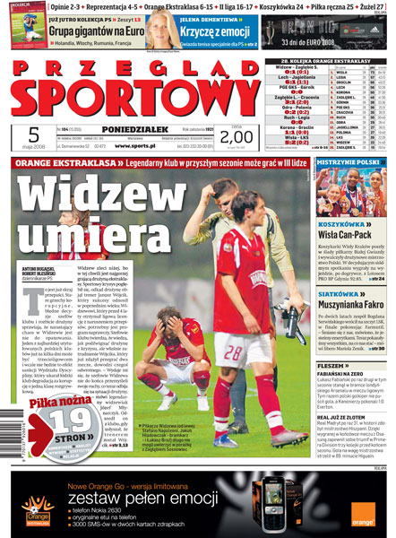 Widzew w przyszłym sezonie może grać w III lidze; gol w doliczonym czasie uratował szanse Groclinu na europejskie puchary; w 28. kolejce Orange Ekstraklasy nie brakowało rażących sędziowskich pomyłek, za które płacą piłkarze; Bayern już zapewnił sobie mistrzostwo 1. Bundesligi; Swietłana Kuzniecowa wgrała Suzuki Warsaw Masters; koszykarki Wisły po raz dwudziesty mistrzyniami Polski; polska reprezentacja w piłce ręcznej może stracić czołowego strzelca; Mateusz Gucman i Radosław Horbik zdobyli kwalifikacje olimpijskie; triumf Muszynianki Fakro; afera dopingowa w amerykańskiej lekkoatletyce - Polacy mają szanse na medale MŚ sprzed lat.