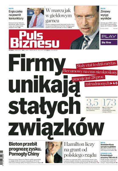 Firmy unikają stałych umów z pracownikami; Bioton przebił prognozę zysku dzięki pomocy Chin; Hamilton liczy na grant od polskiego rządu; Ergis czeka na powrót koniunktury; w marcu jak w giełdowym garncu; wysyp wyników za ostatni kwartał 2010 r.; nadzór nad instytucjami finansowymi ma pomóc inwestorom; PGE nadrobiła braki; na rynek wynajmu biur wraca koniunktura.