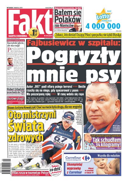 Fajbusiewicz: pogryzły mnie psy; Władysław Bartoszewski: bałem się Polaków, nie Niemców; kto dostał Oscara; piloci specpułku nie lubili Błasika; Hubert Urbański przechodzi do TVP; Justyna Kowalczyk mistrzynią świata zdrowych; jak Rudi Schuberth schudł 34 kilogramy; Villas rusza w tournée po Polsce; młodym nie zależy na pieniądzach, wolą wyzwania; jakimi absurdami gnębią nas urzędy; wszystkie biurowe plagi; czy Maciej T. udusił w łóżku kochankę.