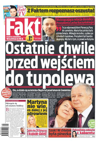 Ostatnie chwile przed wejściem do tupolewa; poznaj metody na wyłudzenie pieniędzy i uniknij oszusta; odczepcie się od senatora Stokłosy; Martyna Wojciechowska nie wie, co dalej z jej zdrowiem; szok – w chlebie była pinezka; Pakosińska odeszła z Kabaretu Moralnego Niepokoju; sejm ma 59 limuzyn i kupuje dalej; szukają świadków kłótni z Błasikiem; o wyborach na wesoło; Kasia Tusk – zapracowana, a tak ładnie wygląda; w Libii walczą, a nam frank szaleje; pani Ilona zrobiła zasadzkę na bandytów; dostał wypłatę, bo groził, że skoczy; Bjoergen powinna biegać z mężczyznami.
