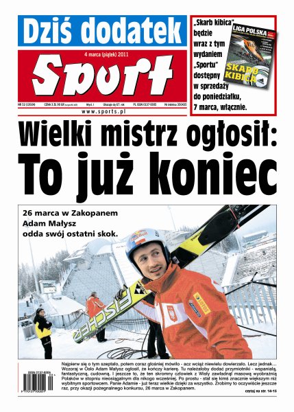 26 marca w Zakopanem Adam Małysz odda swój ostatni skok w zawodowej karierze; właściciel warszawskiej Polonii rozgrzeszył wszystkich swoich podwładnych; Robert Maaskant, szkoleniowiec Wisły Kraków, jest przekonany, że jego drużyna wywalczy w meczu z Ruchem Chorzów trzy punkty; wywiad z Małgorzatą Trybańską, 33-krotną medalistką krajowych mistrzostw w skoku w dal i trójskoku.