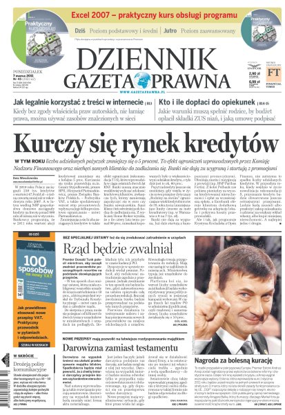 Jak legalnie korzystać z treści w internecie; jakie warunki muszą spełnić rodzice, by budżet opłacił składki ZUS niań, i jaką umowę podpisać; w tym roku liczba udzielanych pożyczek zmniejszy się o 5 procent - to efekt ograniczeń wprowadzonych przez Komisję Nadzoru Finansowego oraz niechęci samych klientów do zadłużania się; premier Donald Tusk polecił ministrom, aby zaczęli zwalniać pracowników poszczególnych resortów na podstawie obowiązujących przepisów; nowe przepisy mają pozwolić na łatwiejsze rozdysponowanie majątkiem.