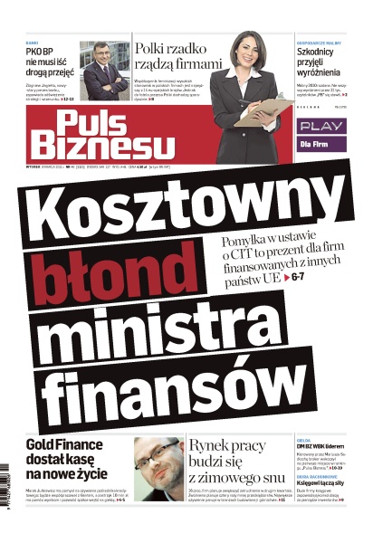Kosztowna pomyłka ministra finansów w ustawie o CIT; Gold Finance dostał kasę na nowe życie; rynek pracy budzi się z zimowego snu; PKO BP nie musi iść drogą przejęć; współczynnik feminizacji wysokich stanowisk w polskich firmach jest najwyższy z 14 europejskich krajów; Gospodarcze Maliny 2010 rozdane; DM BZ WBK liderem w rankingu „Pulsu Biznesu”; duże firmy księgowe zapowiadają konsolidację za pieniądze inwestorów.