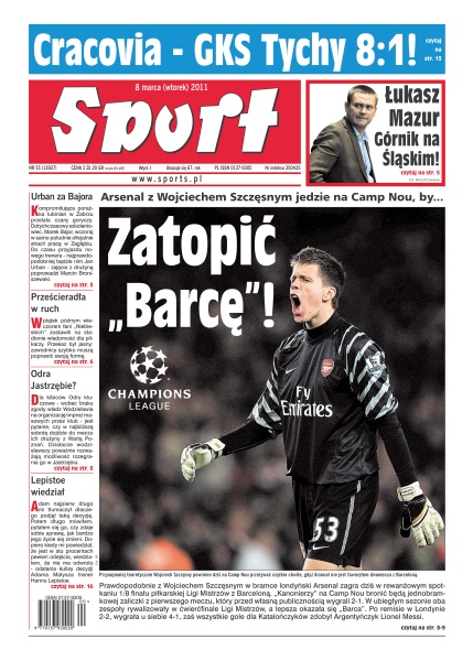 Arsenal z Wojciechem Szczęsnym jedzie na Camp Nou, by zatopić „Barce”; Marek Bajor oficjalnie stracił pracę w Zagłębiu Lubin - zastąpi go najprawdopodobniej Jan Urban; Cracovia pokonała GKS Tychy 8:1; działacze Odry Wodzisław rozważają rozegranie meczu z Wartą Poznań w Jastrzębiu; Hannu Lepistoe o przyszłości skoków narciarskich.
