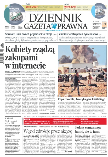 Kobiety rządzą zakupami w internecie; ropa zdrożała, Ameryka goni Kaddafiego; poobijane kryzysem firmy znów zaczęły zatrudniać; węgiel zdrożeje przez akcyzę; Polacy cenią swoje banki, ale te tanie; Tusk rozsądzi spór o OFE; policja bezprawnie publikuje zdjęcia.