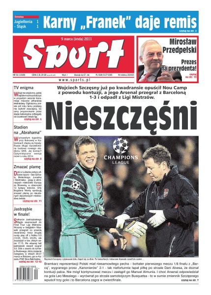 Wojciech Szczęsny już po kwadransie opuścił Nou Camp z powodu kontuzji; Arsenal przegrał z Barceloną 1:3; nie wiadomo, gdzie będzie można zobaczyć w przyszłym sezonie transmisje meczów piłkarskiej ekstraklasy; w przyszłym tygodniu w Katowicach ruszy budowa nowego stadionu GKS; dziś w Lublanie polscy piłkarze ręczni grają w eliminacjach mistrzostw Europy ze Słowenią; siatkarze Jastrzębskiego Węgla awansowali do Final Four Ligi Mistrzów.