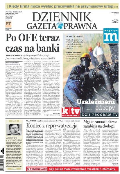 Kiedy firma może wysłać pracownika na przymusowy urlop; PGE EO utopiła miliony w projekcie budowy elektrowni wiatrowej; nowy podatek zapłacą wszystkie instytucje finansowe: banki, firmy pożyczkowe, nawet SKOK-i; właściciele majątków znacjonalizowanych w PRL nie dostaną odszkodowań; weekendowe szczyty strefy euro i Unii mają zdecydować o przyszłości Wspólnoty; trzy miliardy złotych rocznie wart jest rynek usług związanych z pielęgnacją samochodów.