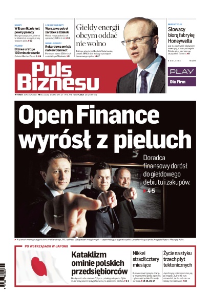 Open Finance wyrósł z pieluch; w Erze nikt nie jest pewny posady; biznes uratuje 100 mln zł rocznie; Warszawa potroi zarobek z działek; Platinium zbiera 250 mln zł na działkę w Moskwie; giełdy energii obcym oddać nie wolno - twierdzi prezes GPW; Słowacy biorą fabrykę Honeywella; kataklizm w Japonii ominie polskich przedsiębiorców; Nikkei stracił cztery miesiące; jak wygląda życie na styku trzech płyt tektonicznych.