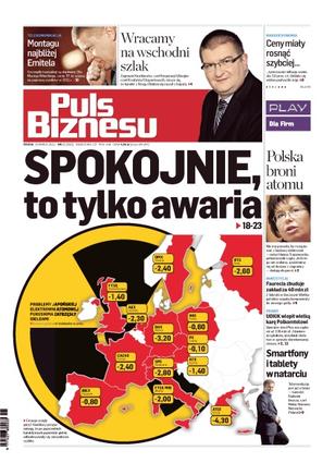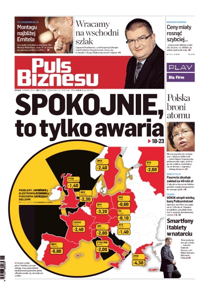 Problemy japońskiej elektrowni atomowej Fukushima zatrzęsły giełdami; ceny miały rosnąć szybko tymczasem inflacja wyniosła 3,6%; Korporacja Ubezpieczeń Kredytów Eksportowych cieszy się, że handel z Rosją i Białorusią ruszył z kopyta; Polska broni atomu; Faurecia zbuduje zakład za 40 mln zł; UOKiK wlepił wielką karę Polkomtelowi; smartfony i tablety w natarciu; Montagu najbliżej Emitela.