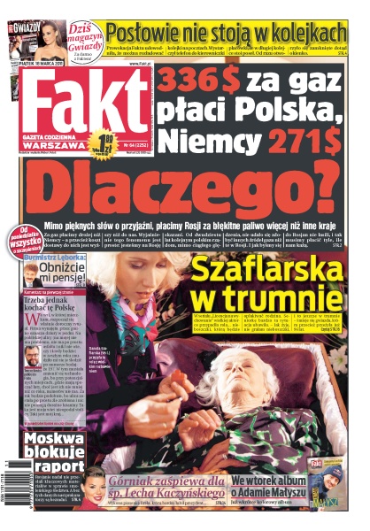 Mimo pięknych słów o przyjaźni, płacimy Rosji za gaz więcej niż inne kraje; Danuta Szaflarska gra nieboszczkę; burmistrz Lęborka prosi o obniżenie pensji; Moskwa blokuje raport; Edyta Górniak zaśpiewa dla śp. Lecha Kaczyńskiego; na poczcie posłowie nie stoją w kolejkach.