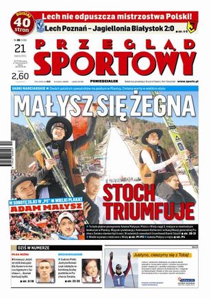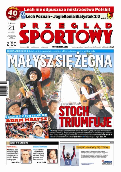 Piękny koniec zimy dla polskich sportowców: Kamil Stoch wygrał loty w Planicy, Adam Małysz oddał ostatni skok w swojej karierze, a Justyna Kowalczyk odebrała Kryształową Kulę; przegląd najciekawszych wydarzeń 19. kolejki piłkarskiej ekstraklasy; Ireneusz Jeleń strzelił dwa gole dla Auxerre w meczu ligowym z Sochaux; Witalij Kliczko obronił pas mistrza świata organizacji WBC.