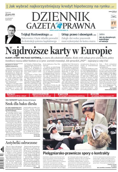 Opłaty pobierane od transakcji kartami są niewidoczne dla klienta, ale bolesne dla przedsiębiorców; cięcie składki prowadzi do destrukcji systemu kapitałowego – mówi Leszek Balcerowicz; jak wybrać najkorzystniejszy kredyt hipoteczny na rynku; litr oleju napędowego kosztował wczoraj w hurcie tyle samo, ile litr benzyny; nie od 1 lipca, jak jeszcze niedawno informowało Ministerstwo Finansów, lecz dopiero od 1 stycznia 2012 r. wejdą w życie zmiany w Ordynacji podatkowej.
