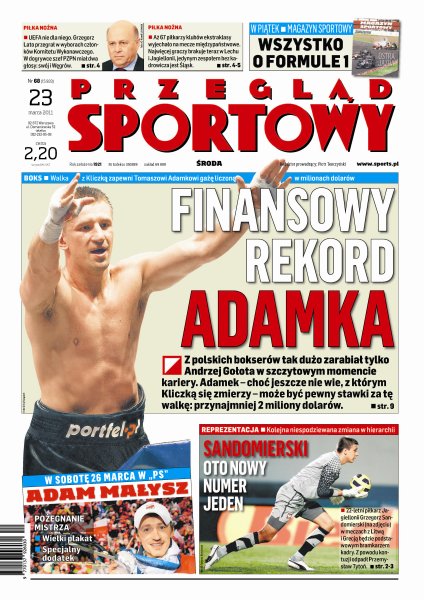 Finansowy rekord Tomasza Adamka – z polskich bokserów tak dużo zarabiał tylko Andrzej Gołota w szczytowym momencie swojej kariery; Grzegorz Lato przegrał w wyborach członków Komitetu Wykonawczego UEFA; Grzegorz Sandomierski będzie podstawowym bramkarzem reprezentacji Polski w meczach z Litwą i Grecją; Messi pod względem zarobków i umiejętności bije wszystkich innych piłkarzy świata.