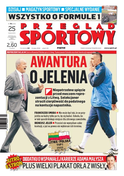 Awantura o Ireneusza Jelenia; skład na mecz Litwa-Polska; rozmowa z Dariuszem Dudką; Franciszek Straka został nowym trenerem Arki Gdynia; rozmowa z Jackiem Zielińskim - nowym trenerem Polonii Warszawa; pożegnanie Adama Małysza; Formuła 1 – Grand Prix Australii; walka Alberta Sosnowskiego; Władymir Kliczko podpisał kontrakt na walkę z Davidem Haye'em; rozmowa z Małgorzatą Glinką-Mogentale.