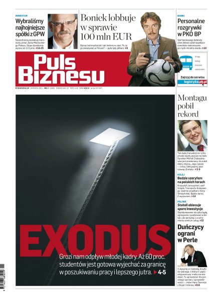 Grozi nam odpływ dobrze wyszkolonej i wykształconej młodej kadry, aż 60 proc. studentów jest gotowa wyjechać za granicę; nowy właściciel Emitela zamierza zainwestować w spółkę 200 mln zł; sport traci na zakazie reklamy internetowych bukmacherów; część akcjonariuszy browaru Perła wejdzie na ścieżkę sądową; zaczynają się przesłuchania kandydatów do zarządu PKO BP.
