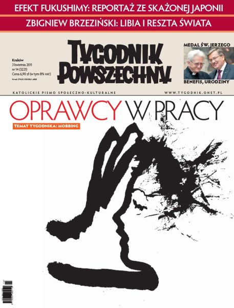 Temat „Tygodnika”: mobbing (m.in. rozmowa z Leszkiem Mellibrudą, raport o „podkulturze podgryzania” i wywiad z Jagną Marczułajtis-Walczak, która skierowała do sądu pracy pozew przeciwko trenerowi kadry snowboardowej); relacja z benefisu ks. Adama Bonieckiego, Medali św. Jerzego i 66. urodzin „Tygodnika Powszechnego”; historyk Bożena Szaynok polemizuje z Janem Tomaszem Grossem i Ireną Grudzińska-Gross, autorami książki „Złote żniwa”; Przemysław Wilczyński na przykładzie niedawnego protestu pielęgniarek analizuje narastający dystans świata polityki i związków zawodowych; Konrad Piasecki pisze o nowych szatach prezesa PiS, po słynnej już eskapadzie Jarosława Kaczyńskiego na zakupy do osiedlowego sklepu; reportaż Michała Olszewskiego z odwiedzin powiatu miechowskiego, w którym opisuje znikanie małych szkół; rozmowa ze Zbigniewem Brzezińskim o sytuacji w krajach arabskich, zagrożeniu terroryzmem i kłopotach Ameryki z wiarygodnością; korespondencja Piotra Bernardyna z Tokio o życiu w Japonii w cieniu trwającej cały czas atomowej katastrofy; Marek Kęskrawiec o arabskiej Wiośnie Ludów 2011; na IV Dzień Świadomości Autyzmu Rafał Motriuk, ojciec ośmioletniego Bartka z autyzmem, rozmawia z Anną Brummer, matką dziecka chorego na autyzm; Litwa przeciw wspomnieniom; wydanie najnowszej książki Stefana Chwina stało się pretekstem do rozmowy z pisarzem; przed premierą filmu „Somwhere” Sofii Coppoli; Daniel Cichy z premiery baletu Krzysztofa Pastora „I przejdą deszcze...”.
