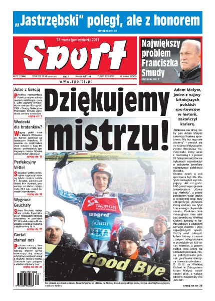 Adam Małysz zakończył karierę; Polacy przygotowują się do meczu z Grecją; David Villa strzelił dwie bramki w meczu z Czechami; Górnik Zabrze w meczu z Ujpestem w Budapeszcie uczcił pamięć Ferenca Szuszy; szczypiornistki z Lublina zagrają w półfinale PGNiG Superligi; Sylwia Gruchała po 21 miesiącach odniosła zwycięstwo w Pucharze Świata; Marcin Gortat złamał nos w meczu koszykówki z New Orleans Hornets.