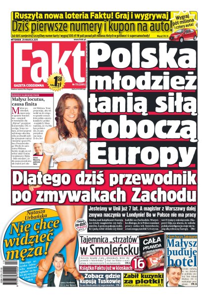 Energiczna i dobrze wyszkolona polska młodzież jest tanią siłą roboczą Europy; zobacz, w jakich sklepach robi zakupy rodzina Tusków; Adam Małysz ma bardzo ambitne plany biznesowe na przyszłość; dlaczego Natasza Urbańska zabrania swojemu mężowi oglądać na żywo swoje występy w TVP.