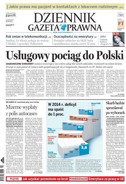Zagraniczne koncerny masowo otwierają u nas centra usług dla swoich oddziałów rozsianych na całym świecie, pracuje w nich ponad 40 tysięcy osób specjalizujących się w księgowości, finansach czy IT; co klienci zyskają na wejściu T-Mobile i sprzedaży Polkomtela; pieniądze uzbierane na IKZE będą opodatkowane stawką nawet 32 proc.; jakie prawa ma pacjent w kontaktach z lekarzem rodzinnym; w ciągu najbliższych trzech lat radykalnie poprawi się sytuacja finansów publicznych.
