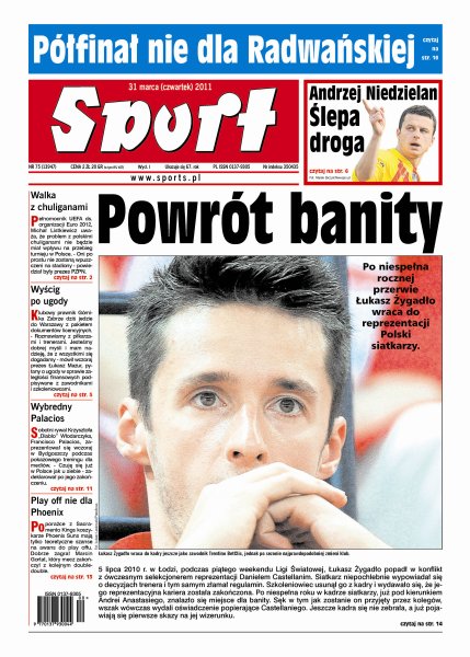 Po niespełna rocznej przerwie Łukasz Żygadło wraca do reprezentacji Polski siatkarzy; Michał Listkiewicz, pełnomocnik UEFA ds. organizacji Euro 2012, uważa, że problem z polskimi chuliganami nie będzie miał wpływu na przebieg turnieju w Polsce; prawnik Górnika Zabrze dziś jedzie do Warszawy z pakietem dokumentów licencyjnych; sobotni rywal Krzysztofa „Diablo” Włodarczyka, Francisco Palacios, zaprezentował się wczoraj w Bydgoszczy podczas pokazowego treningu dla mediów.