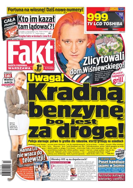 3 850 000 zł – za tyle zlicytowano rezydencję lidera Ich Troje Michała Wiśniewskiego; rabusie zaczęli na masową skalę kraść benzynę z baków samochodów parkowanych na osiedlowych parkingach; Hanna Lis nie wraca na razie na antenę telewizyjną; Mirosław Pawlak rozprowadza w Sejmie świeże jaja w cenie 60 gr za sztukę; nastolatek skatował koleżankę z zazdrości.