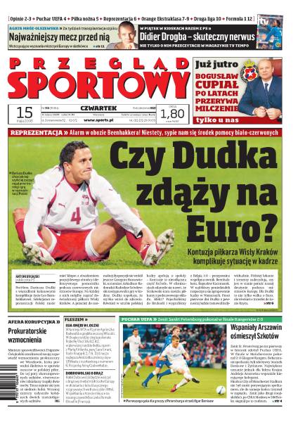 Kontuzja Dariusza Dudki dużym kłopotem dla Leo Beenhakkera, kto odpowiada za awanturę na boisku podczas finału Pucharu Polski, Zenit St. Petersburg rozbił Glasgow Rangers, Francuz chce grać w polskiej kadrze piłkarskiej, Lech Poznań przygotowany na wydanie miliona na napastnika, Agata Mróz-Olszewska przygotowuje się do przeszczepu szpiku, 4,5 mln dolarów kosztowała przeróbka toru F1 w Montrealu, Justine Henin kończy karierę.