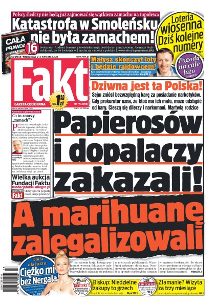Sejm zniósł bezwzględną karę za posiadanie narkotyków; to nie zamach był przyczyną katastrofy Tu-154; Adam Małysz chce wystartować w Rajdzie Dakar; legnicki biskup ostrzega wiernych przed niedzielnymi zakupami; Doda cierpi po rozstaniu z Nergalem; Małgorzata Foremniak chce odejść z „Mam talent”; w niedzielę pierwsza kolejka ligi żużlowej.