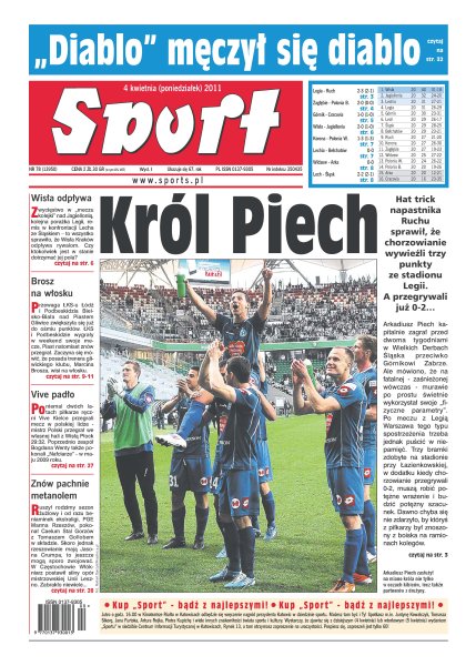 Po prawie 28 latach i 21 meczach rozegranych na tym stadionie, „Niebiescy” wreszcie podbili Łazienkowską; to były dwa wyjątkowo trudne tygodnie przy Roosevelta – zwycięstwo nad Cracovią jest jak łyk tlenu dla omdlewającego; Milan w 276. derbach Mediolanu pokonał Inter 3-0, zdobywając pierwszą bramkę w 43 sekundzie; Real Madryt przegrał na Estadio Bernabeu ze Sportingiem Gijon i ma już osiem punktów straty do Barcelony; wielki sukces Wiktorii Azarenki, która powtórzyła wyczyn z 2009 roku, wygrywając Sony Ericsson Open w Miami z pulę 4,5 miliona dolarów.