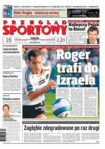 Kanadyjski miliarder chce ściągnąć Rogera do Izraela, Zagłębie Lubin ponownie zdegradowane do II ligi - Jagiellonia szczęśliwa, "Polacy, nie róbcie sobie nadziei" - Lothar Matthaus o naszych szansach na wyjście z grupy, Zenit miał budżet 150 mln euro i Dicka Advocaata, Bogusław Cupiał mówi o planach wobec Wisły Kraków, tajniki zużycia opon w bolidach Formuły 1.