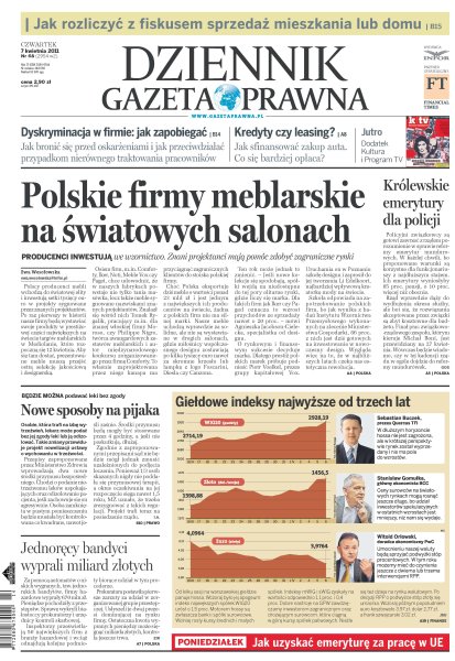 Polskie firmy meblarskie na światowych salonach; jak zapobiegać dyskryminacji w firmie; kredyty czy leasing; królewskie emerytury dla policji; nowe sposoby na pijaka; jednoręcy bandyci wyprali miliard złotych; giełdowe indeksy najwyższe od trzech lat; jak rozliczyć z fiskusem sprzedaż mieszkania lub domu.