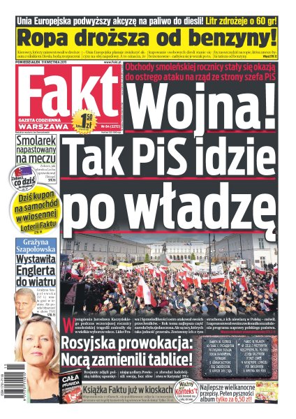 Obchody smoleńskiej rocznicy stały się okazją do ostrego ataku na rząd ze strony szefa PiS; rosyjska prowokacja – nocą zamienili tablice; Grażyna Szapołowska wystawiła Jana Englerta do wiatru; Smolarek napastowany podczas meczu; ropa droższa od benzyny.