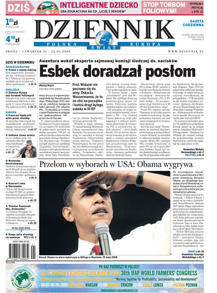 Awantura wokół eksperta sejmowej komisji śledczej: prof. Widacki oskarża Zbigniewa Wassermanna, kim jest Jan Widacki oraz tragiczna historia ofiary Jerzego Stachowicza; dobiega końca proces w sprawie śmierci Grzegorza Przemyka; w listopadowych wyborach Barack Obama będzie walczył z Johnem McCainem; ekologia: Irlandia - kolejny kraj wolny od torebek foliowych; reforma polityki rolnej UE ograniczy dopłaty bezpośrednie dla rolników; Manchester United walczy z Chelsea o zwycięstwo w Lidze Mistrzów: Tomasz Kuszczak marzy o grze w finale; Indiana Jones powraca w wielkim stylu.